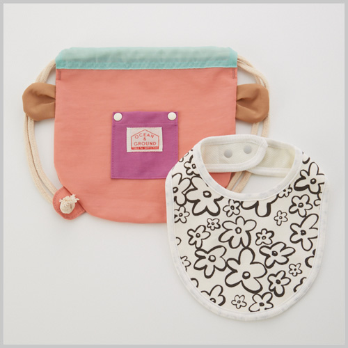 スタイとナイロン素材のナップサックのセット。
