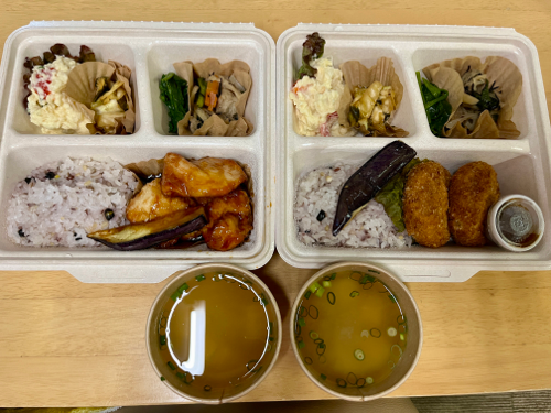 おかずとおむすびは半分ずつ食べます。