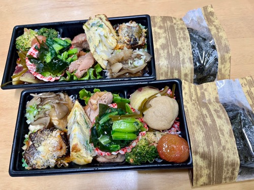 酵素玄米おにぎりとおかずのお肉。